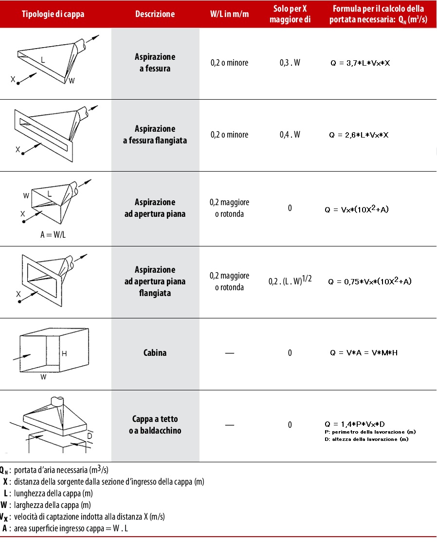 In fase di progettazione la velocità di cattura viene utilizzata per stabilire la portata d’aria (Q) in m3/ora necessaria del sistema di aspirazione. Partendo dalla equazione di Dalla Valle è possibile ricavare le formule per il calcolo della portata necessaria alle diverse tipologie di cappe come da schema seguente: